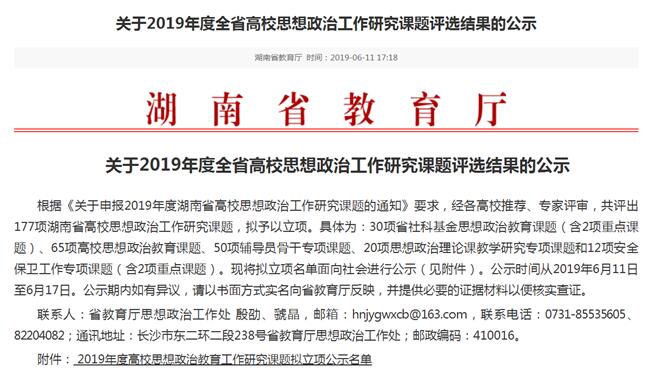 近日,湖南省教育厅下发《关于申报2019年度湖南省高校思想政治工作研究课题的通知》,经各高校推荐、专家评审,公司教师邢鹏飞主持《高校用习近平新时代中国特色社会主义思想铸魂育人方法创新研究》、陈丽荣主持《“互联网+”时代老员工社会主义意识形态认同现状与对策研究》均获省社科基金课题立项、冷舜安主持的《构建人类命运共同体视域下老员工全球意识培育研究》获高校思想政治教育课题立项。