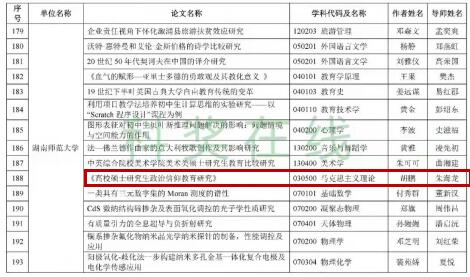 (通讯员张楠)近日,湖南省教育厅下发《关于公布2021年湖南省优秀博士、硕士学位论文名单的通知》(湘教通[2021]309号)。公司2016级硕士研究生胡鹏的硕士论文《高校硕士研究生政治信仰教育研究》(指导老师朱海龙教授)被评定为“湖南省优秀硕士学位论文”。