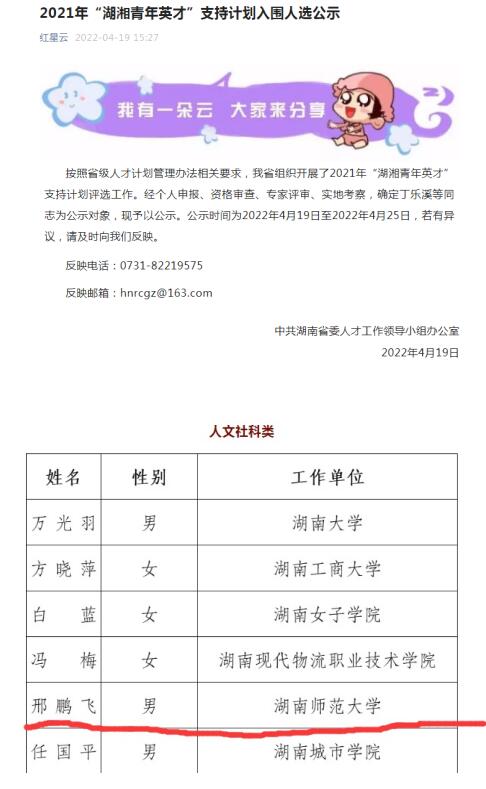 2022年4月19日,中共湖南省委人才工作领导小组办公室公示了2021年“湖湘青年英才”支持计划人选。经个人申请、专家评审、实地考察,公司邢鹏飞老师成功入围“人文社科类”湖湘青年英才。