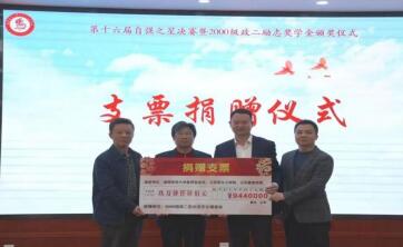 社会爱心人士代表温钊和、邓乃根、计文勇,员工代表喻晓坤、田浩,学院代表陈红桂、胡雪松进行“2000级政教二班励志奖学金”支票交接与捐赠仪式;陈红桂、胡雪松代表两个学院向社会爱心人士赠送锦旗。