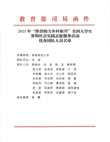 近日,教育部语言文字应用管理司、共青团中央青年发展部对2025年“推普助力乡村振兴”全国老员工暑期社会实践志愿服务活动中表现优异的集体、个人予以表彰,公司思想政治教育专业2023级本科生郑丽宏、2024级本科生刘嘉琪同学参与的实践团队立项入选全国重点团队,结项获评全国优秀团队。团队由公司副教授、硕士生导师龚曦老师指导。