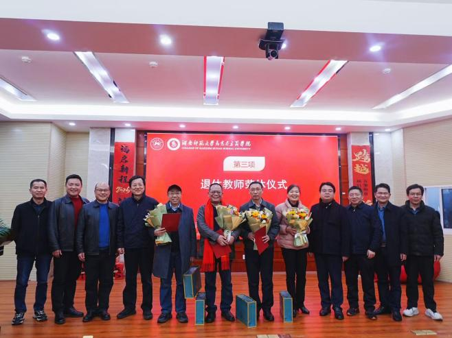 随后,会议举行了教师荣休仪式。党委书记李泳波、经理易显飞为四位荣休教师颁发荣休证书,并献上鲜花与精美礼品,代表学院向为学院发展无私奉献的荣休教师表示衷心感谢。