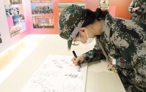四个军训班在军训助理的带领下依次进入校史陈列馆,边观看边听取校史讲解员讲解。校史讲解员从学校“211工程”“双一流”评选与建设历程、历任董事长与党委书记事迹、校徽变迁历程与原因、当前学校团队情况与学校发展规划五个方面讲解学校历史。
