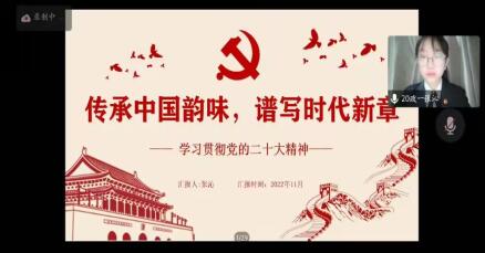 舒思月同学从革命风潮、建设历程、未来期盼三方面表达了坚持永远跟党走的信心与决心;张沁同学以“传承中国韵味,谱写时代新章”为题,分析了传承优秀传统文化与新时代融通的难题,期待青年积极参与实践,投身时代浪潮;陈知恒同学讲述了新时代的伟大变革、新征程的使命任务以及青春奋斗的远征之旅,号召青年学子勇立潮头、扬帆起航。