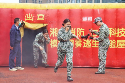 在消防演练环节,新生在教官的指引下,依次进入模拟浓烟环境的黑暗帐篷,以六人为一小组,严格实践“低姿扶墙”的逃生方法,切实体验在能见度低、情况紧急下的火场疏散流程。灭火实操环节,教官现场演示了干粉灭火器的“提、拔、握、压”四步使用法则,并重点强调了操作距离与风向判断等安全要点。在场新生分批次上前,面对模拟火源,规范使用灭火器进行扑救,迅速控制火势。