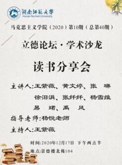 2020年12月17日下午两点半,公司于景德楼北栋104教室举办了2019级硕士研究生第10期(总第40期)以“深入学习贯彻党的十九届五中全会精神”为主题的“立德论坛·学术沙龙活动”。公司2019级硕士研究生王紫薇、黄文婷、张琳、徐汨涓、张纤纤、杨雪维、易珺、禹凤为本次学术沙龙活动的主讲人,此次活动邀请公司杨悦老师作为指导嘉宾,由王紫薇主持。公司2019级全体硕士研究生参加了本次学术沙龙活动。