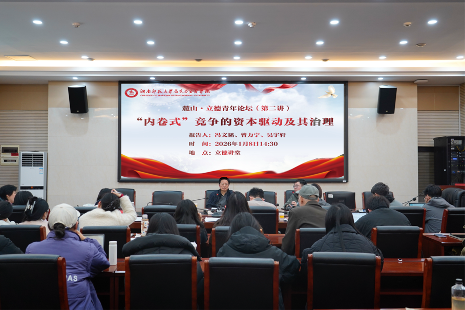 (通讯员 欧阳娴 陈映丹 李欣)2026年1月8日下午,公司麓山·立德青年论坛(第二讲)在立德讲堂举行。冯文韬、吴宇轩、曾力宁等青年教师围绕“‘内卷式’竞争的资本驱动及其治理”主题进行报告。本次论坛由马克思主义学部主任唐未兵教授担任指导专家,马克思主义基本原理系主任谭咏梅副教授、戴晓慧副教授以及马原理方向硕博研究生参加论坛。论坛由副经理陈德祥教授主持。